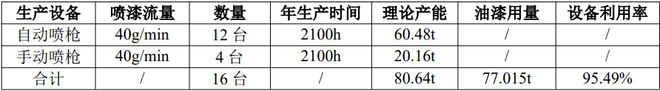 本项目设置1条自动喷漆线把喷枪、手动喷漆柜配备10把喷枪、调漆打样房配备4把喷枪(根据生产经验可知,调漆,打样一年使用水性漆约15kg),年工作300天,每天运行7小时(每天下班前需提前控制停止工件喷漆,确保当日输送带的工件全部烘干固化,预留时间1h)。根据项目实际生产经验可知,项目方采购的喷枪口径为0.8mm,喷枪可调节喷出量,因产品均为小件,且为保证漆膜厚度一致,故需将喷枪喷出量控制在40g/min,同时避免涂料溢出瓶身。项目自动喷漆线和手动喷漆柜常用喷枪共有16支,每支喷枪喷气流量均按照40g/min计,计算可得喷枪喷漆量为300×7h×40g/min×60min×16=80.64t,本项目年用水性漆77.015t,喷枪设备利用率为95.49%。综上,本项目自动喷漆线和手动喷漆柜的喷枪平均产能可满足喷漆需求,与本项目水性漆用量基本匹配。