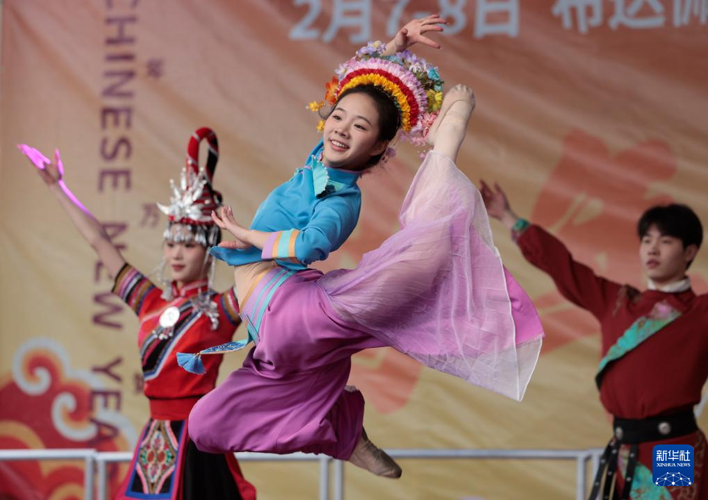 2月7日,演员在匈牙利首都布达佩斯举行的唐人街新春庙会上表演舞蹈。 新华社发(鲍洛格·拉斯洛摄)