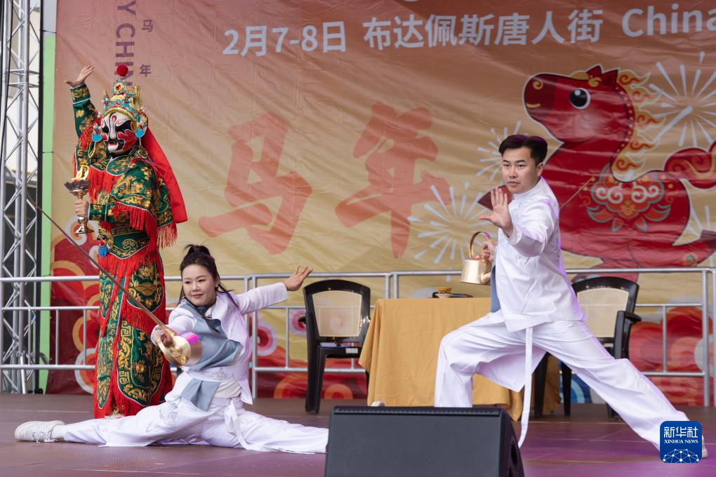 2月7日,演员在匈牙利首都布达佩斯举行的唐人街新春庙会上表演。 新华社发(弗尔季·奥蒂洛摄)